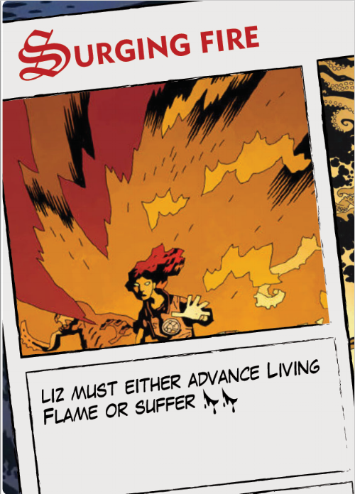 Playing as Liz requires more than a little luck-pushing. You can keep building up her Living Flame to let her cause more damage, but if it gets too high... well, it ain't pretty. Oh, and once again, this isn't a final card. It's a mockup.